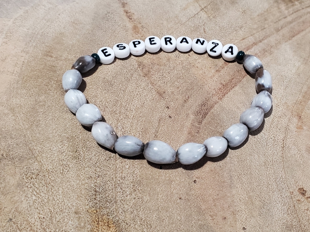 Esperanza (Hope in English Language) Handmade Stretch Bracelet Made of Lagrimas de San Pedro, Alphabet, Black Bead.
