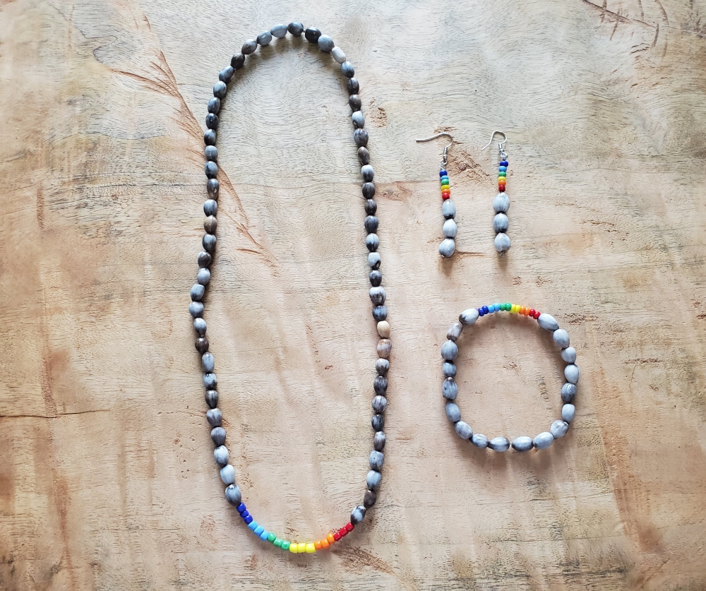 Amaya Handmade Set of Necklace, Stretch Bracelet, A per of Drop Earrings Made of Lagrimas de San Pedro and LGBTQ Colors Bead.