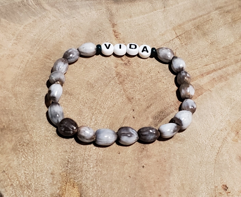 Vida (Life in Spanish Language) Handmade Stretch Bracelet Made of Lagrimas de San Pedro, Alphabet and Dark Green Bead.