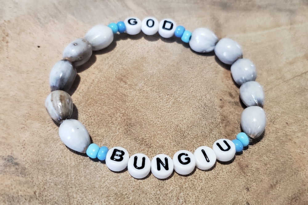 God Bungiu English, Garifuna Language Handmade Stretch Bracelet Made of Lagrimas de San Pedro, Alphabet, Blue and Light Blue Bead.