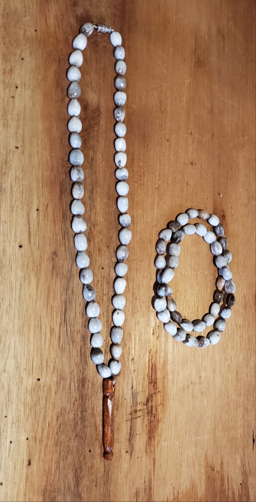 Lujabu Hana Garifuna Legacy Set Handmade A Choker, Made of Lagrimas de San Pedro Small Size Lujabu Hana Drop Chain Made of wood Pecan Satin and Two Stretch Bracelets Made of Lagrimas de San Pedro.