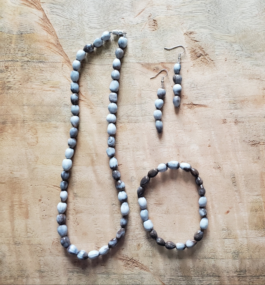 Garifuna Legacy Set Handmade Choker One Stretch Bracelet A per of Drop Earrings Comay, Made of Lagrimas de San Pedro.