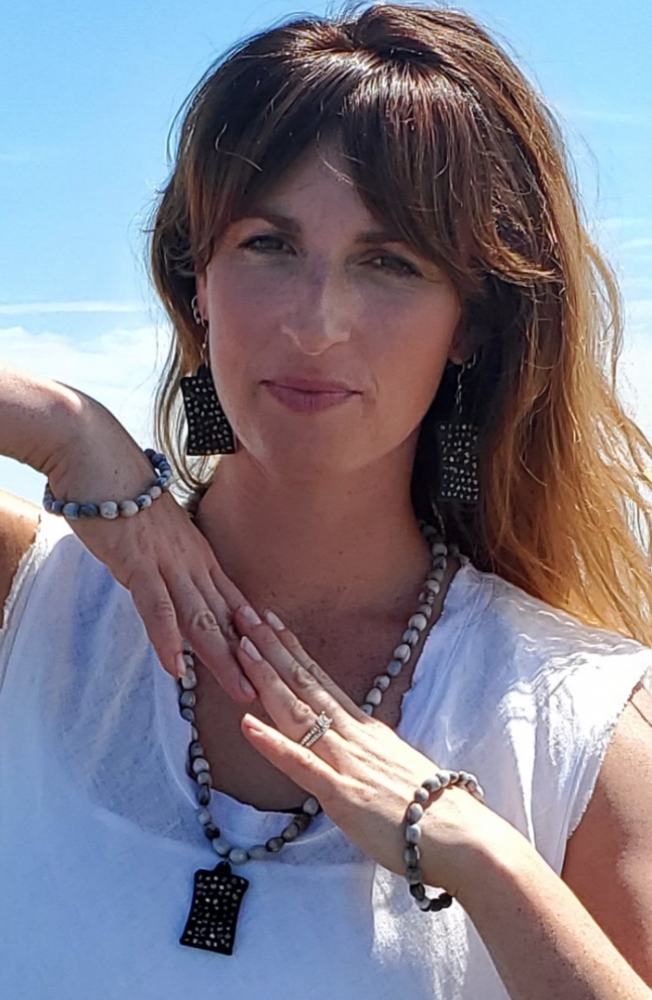 GARIFUNA LEGACY LINE Egy Garifuna Legacy Set Handmade Chain Made of Lagrimas de San Pedro and Small Size Egy Made of Wood and Pebbles Black Satin Drop chain Necklace, A Per of Small Size of Egy Drop Earrings Made of Wood and Pebbles black Satin, Two Stretch Bracelets Made of Lagrimas de San Pedro. $360.00