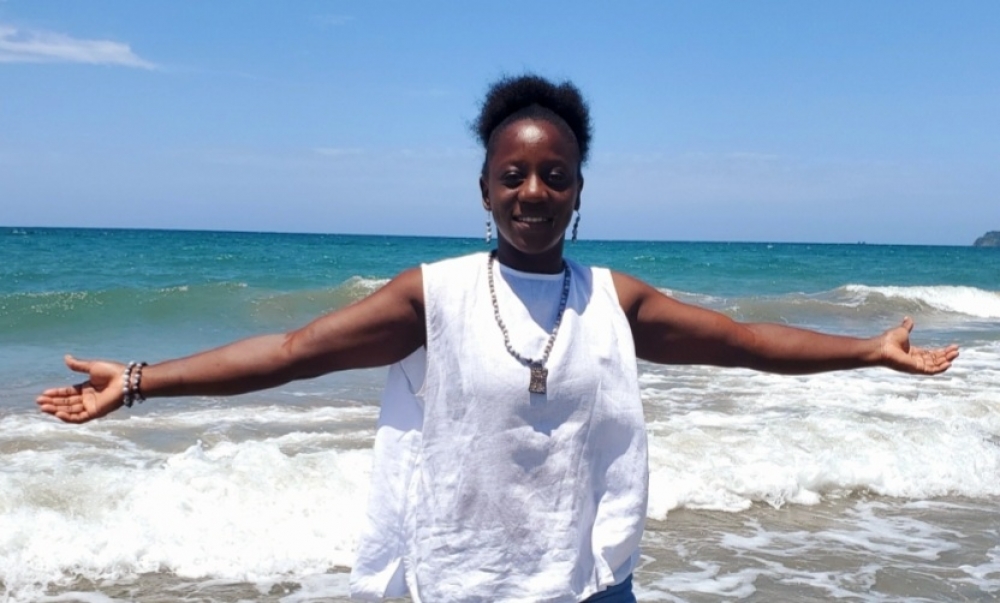 GARIFUNA LEGACY LINE Egy Garifuna Legacy Handmade Necklace Made of Lagrimas de San Pedro and Small Size Egy Made of Wood and Pebbles Black Satin Drop Chain. $160.00