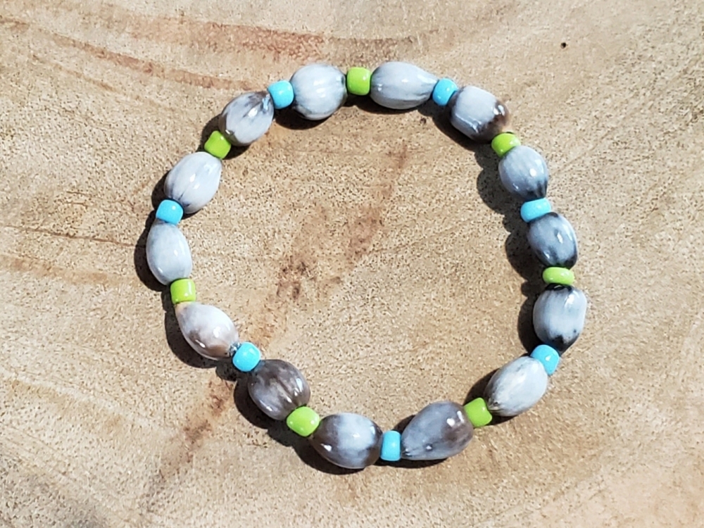 Maeve Handmade Stretch Bracelet Made of Lagrimas de San Pedro with single baby Green and Agua color Beads.