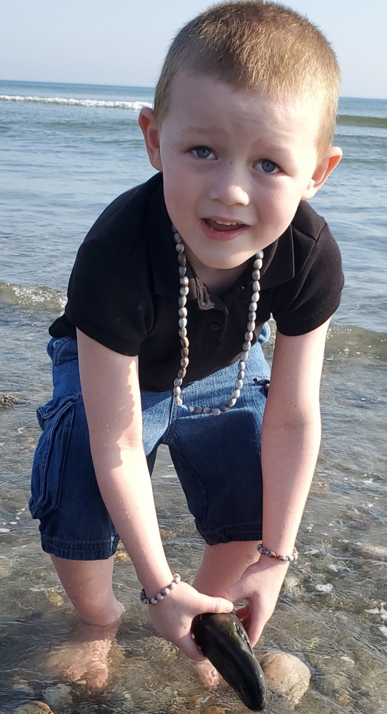 Juan Handmade Stretch Bracelet Made of Lagrimas de San Pedro with single light Blue and Red Beads.
