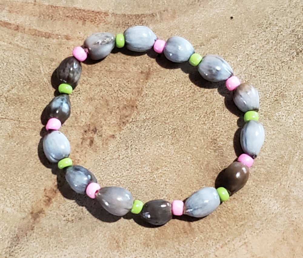 Saoirse Handmade Stretch Bracelet Made of Lagrimas de San Pedro with single Pink and baby Green color Beads.