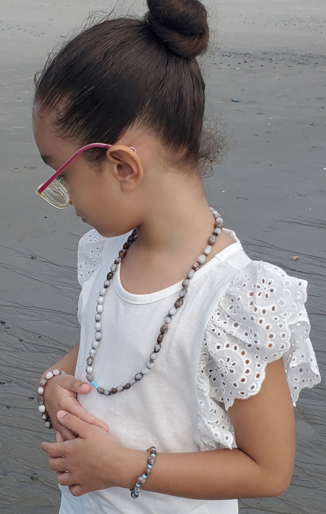 Maeve Set Handmade Necklace Two Stretch Bracelets, One Maeve Necklace Made of Lagrimas de San Pedro and Three Agua color Beads, One Sofya Stretch Bracelet Made of Lagrimas de San Pedro and Agua color Bead, one Garifuna Legacy Stretch Bracelet Made of Lagrimas de San Pedro.