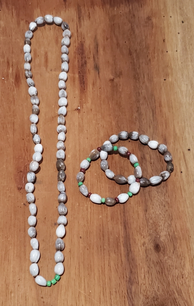 Liam Set Handmade Necklace and Two Stretch Bracelets, One Liam Necklace Made of Lagrimas de San Pedro and Three Green Beads, One Nicco Stretch Bracelet Made of Lagrimas de San Pedro with single Green and Chocolate color Beads, One Garifuna Legacy Stretch Bracelet Made of Lagrimas de San Pedro.