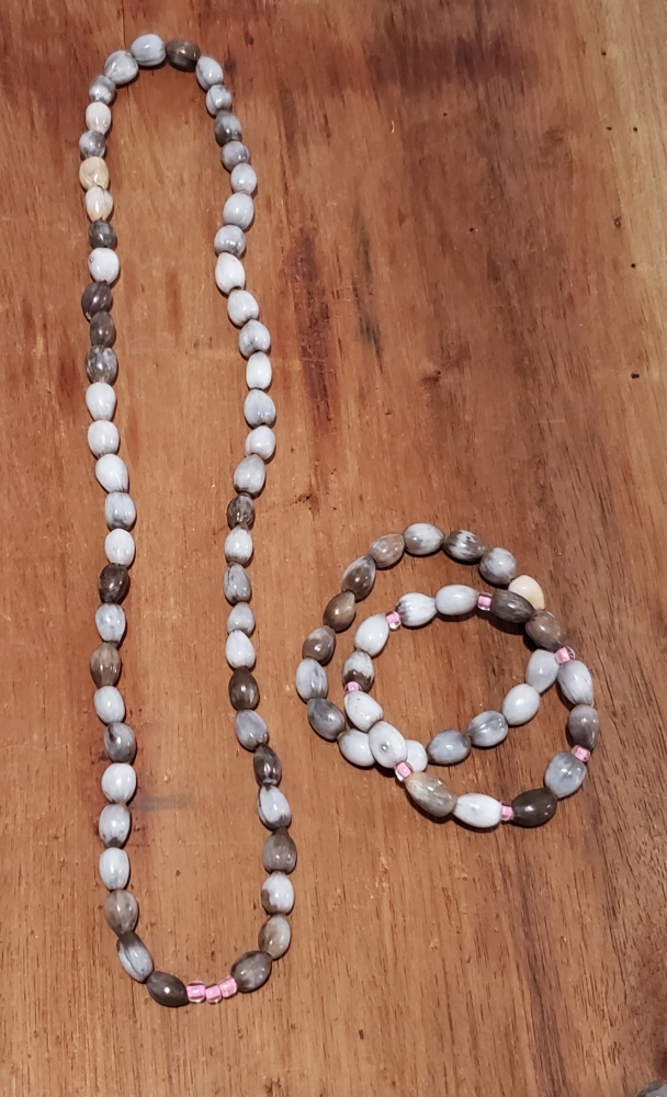 Avelina Set Handmade Necklace Two Stretch Bracelets, One Avelina Necklace Made of Lagrimas de San Pedro and Three Transparent Pink Bead, One Iris Stretch Bracelet Made of double Lagrimas de San Pedro and Transparent pink Bead, One Garifuna Legacy Stretch Bracelet Made of Lagrimas de San Pedro.