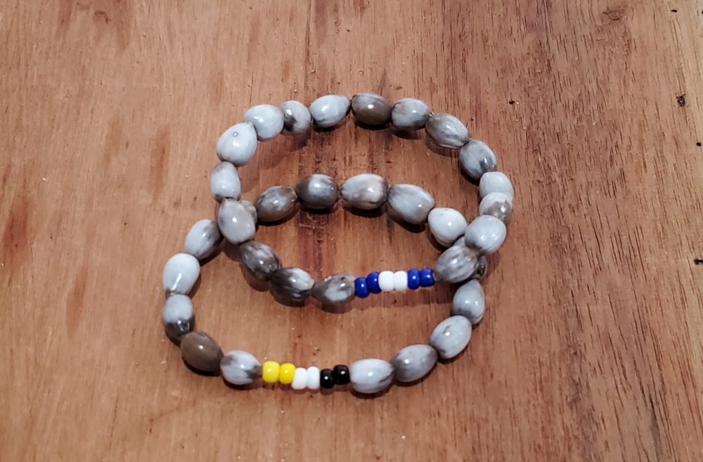 Honduras Garifuna Flag Colors Set Handmade Stretch Bracelets, One Honduras Stretch Bracelet Made of Lagrimas de San Pedro, Blue and White Beads, One Garifuna Flag Stretch Bracelet Made of Lagrimas de San Pedro, Yellow, White and Black Beads.