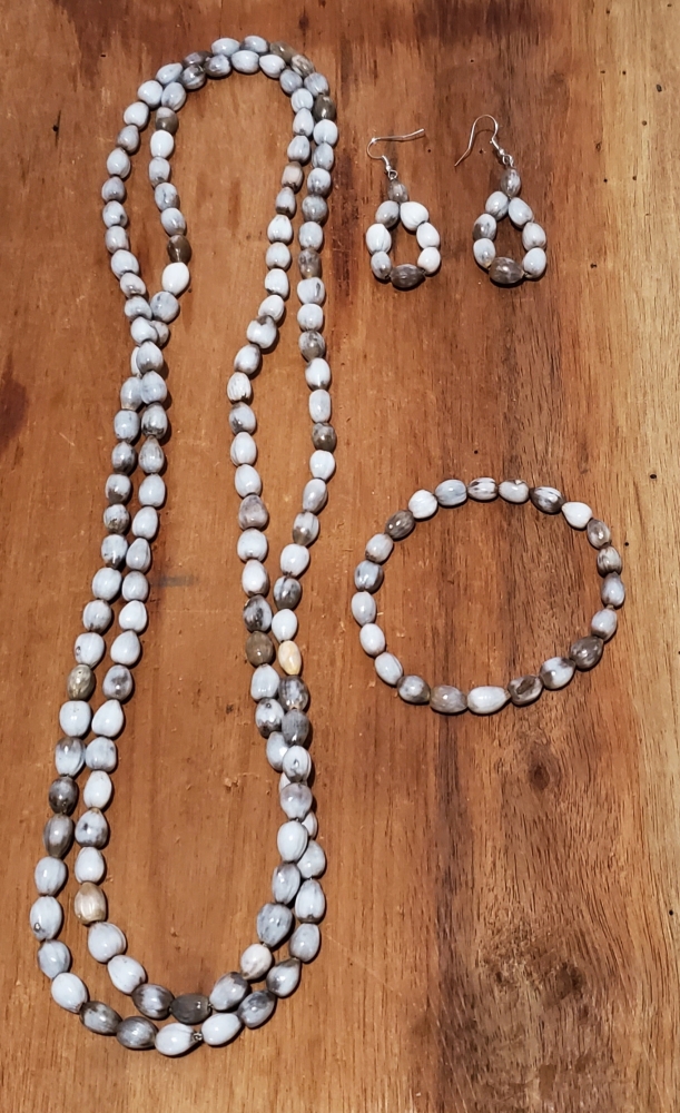 Garifuna Legacy Set Handmade of Two Necklaces A Per of Drop Earrings and Two Stretch Bracelets Made of Lagrimas de San Pedro.