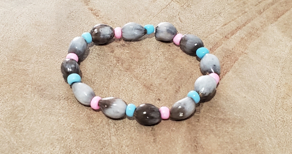 Victoria Handmade Stretch Bracelet Made of Lagrimas de San Pedro with single Pink and Agua color Beads.