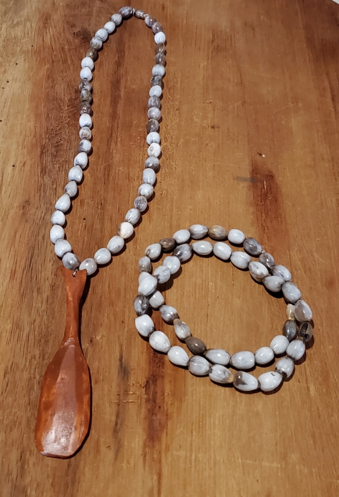 Fagayu Garifuna Legacy Set Handmade Choker, Chain Made of Lagrimas de San Pedro and Medium Size Fagayu Drop Chain Made of wood Pecan Satin and two Stretch Bracelets Made of Lagrimas de San Pedro.
