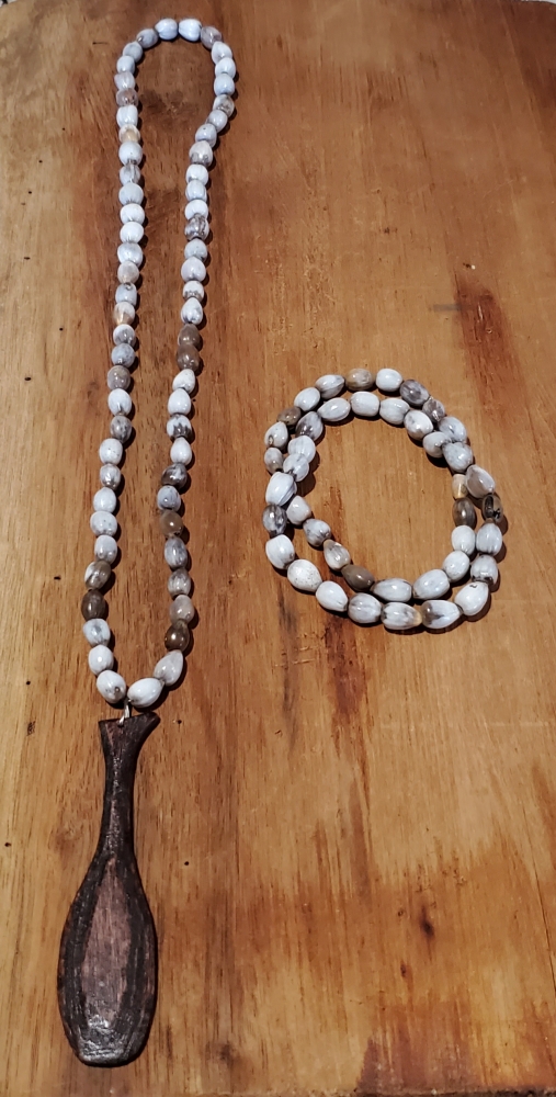 Fagayu Garifuna Legacy Set Handmade Necklace Made of Lagrimas de San Pedro Medium Size Drop Chain Fagayu Made of wood Mahogany Satin and Two Stretch Bracelet Made of Lagrimas de San Pedro.
