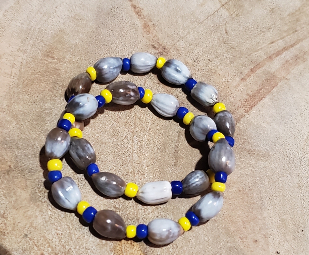 Jean Marcos and Jason Set Handmade Bracelets, One Jean Marcos Stretch Bracelet Made of Lagrimas de San Pedro with single Yellow and Royal Blue Beads. One Jason Stretch Bracelet Made of Lagrimas de San Pedro with double Yellow and Royal Blue Beads.
