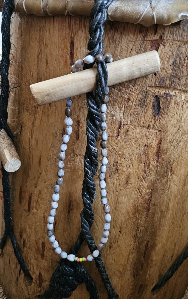 Handmade Necklace Made of Lagrimas de San Pedro with five colors Bead. Two light green, two peach, and one yellow color Bead.