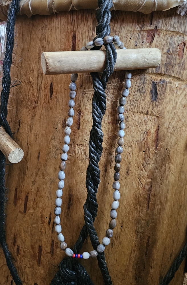 Handmade Necklace Made of Lagrimas de San Pedro with four colors Bead. Two red and two blue color Bead.