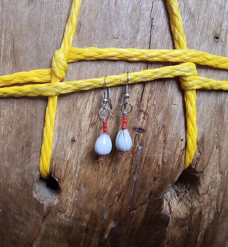 Handmade Small Size Drop Earrings Made of Lagrimas de San Pedro with four Red Bead.